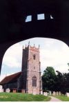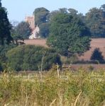 The tip of the church can just be seen to the left of the two pylons. This scene was taken from Pipers Vale looking towards Wherstead Church through the centre arch of the Orwell Bridge.